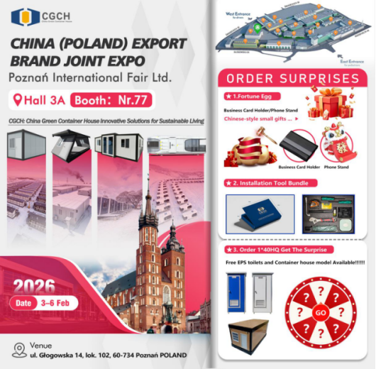 CGCH will showcase its complete range of modular and container home plans at the 2026 China-Poland Export Brand Joint Exhibition. The fair will feature four of our best-selling products: flat-pack container homes, Z-fold container units, expandable container homes, and space capsule cabins.